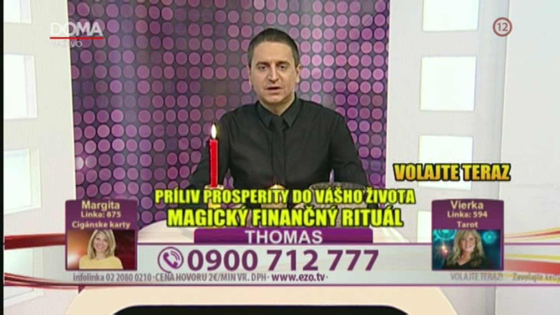 Vážený klienti, chcem sa vám predstaviť. Volám sa Veštec Thomas. Možno ma poznáte vďaka osobnému kontaktu ked ste boli u mna na konzultáciu. Poprípade ma môžete poznať z EZO.TV ( Televízia DOMA ) Venujem sa partnerským a životným problémom. V súčastnosti od 1. 9.2018 neposkytujem osobné konzultácie V Nitre , ale nahrádza ích telefonická konzultácia . Máte teda možnosť vyhnúť sa dlhému čakaniu na termín a kontaktovať ma na mojej línke kde vám zodpoviem na vašé otázky. Ak máte neodkladný problém vo vašom partnerskom vzťahu, alebo akýkoľvek iný problém- neváhajte moju linku 0900 705 900 vytočiť, a zavolať mi hneď teraz.